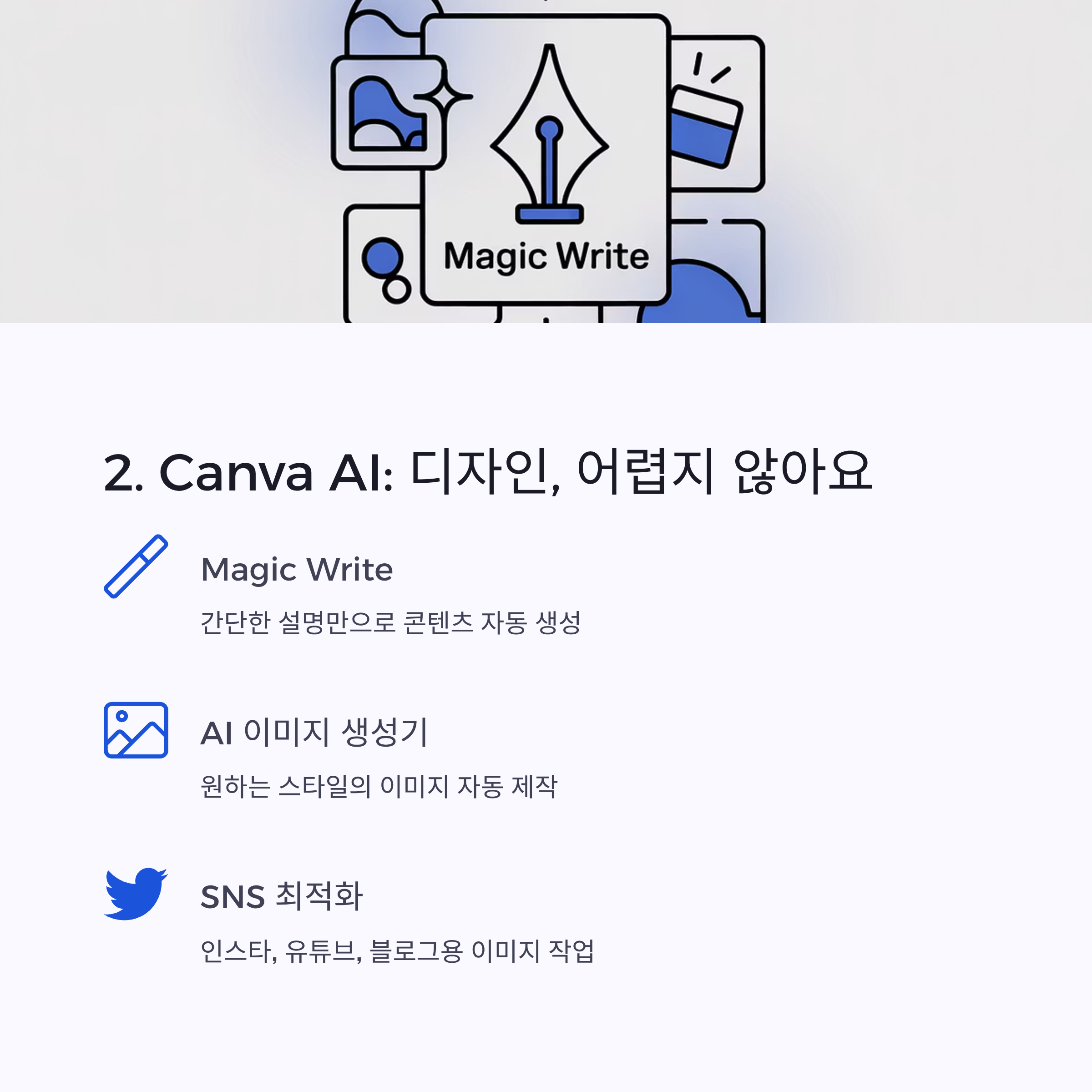 | Canva AI | 디자인, 이미지 생성 | SNS 콘텐츠, 썸네일 디자인 |