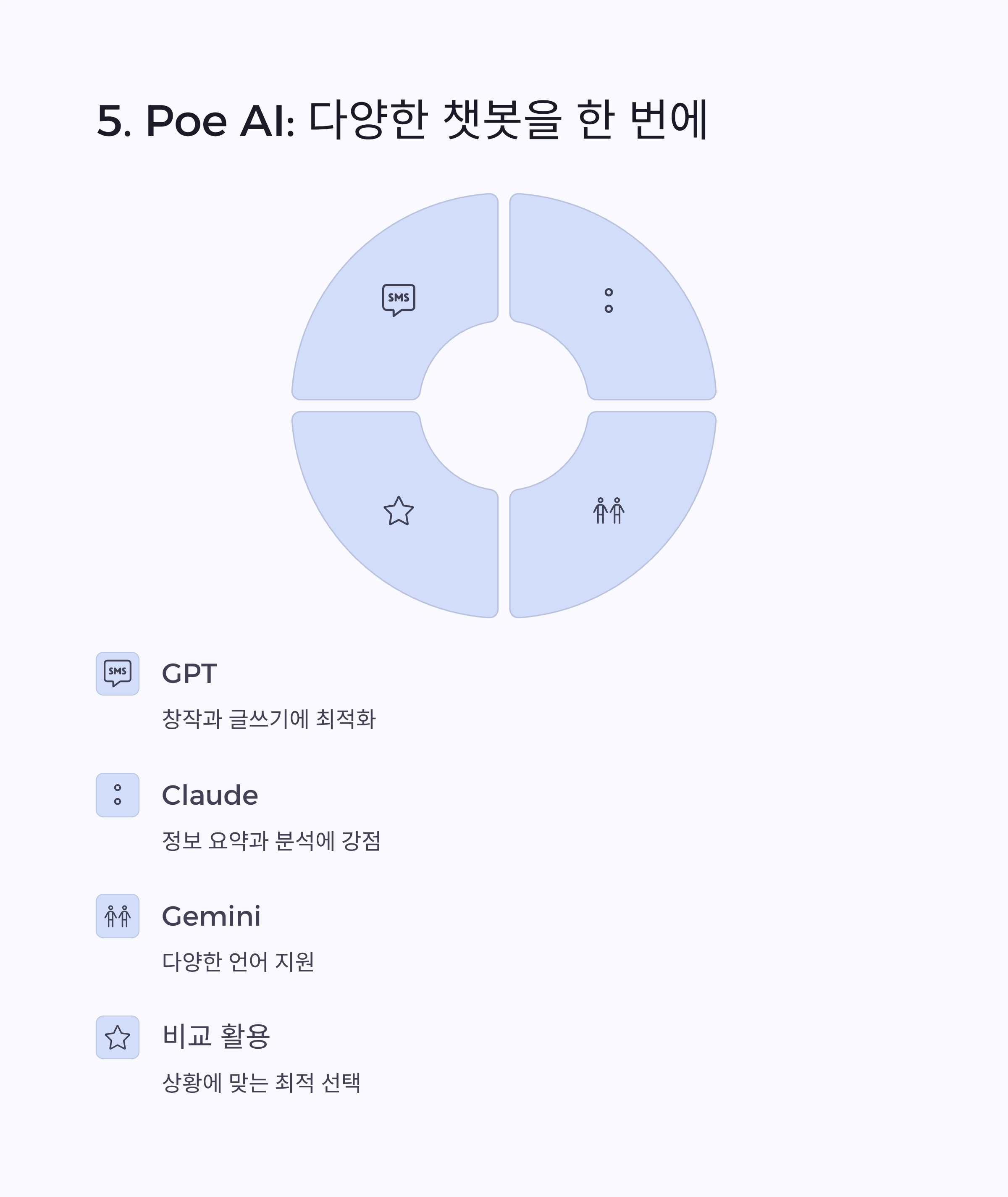 | Poe AI | 다양한 챗봇 접근 | 비교 사용, 테스트 목적 |