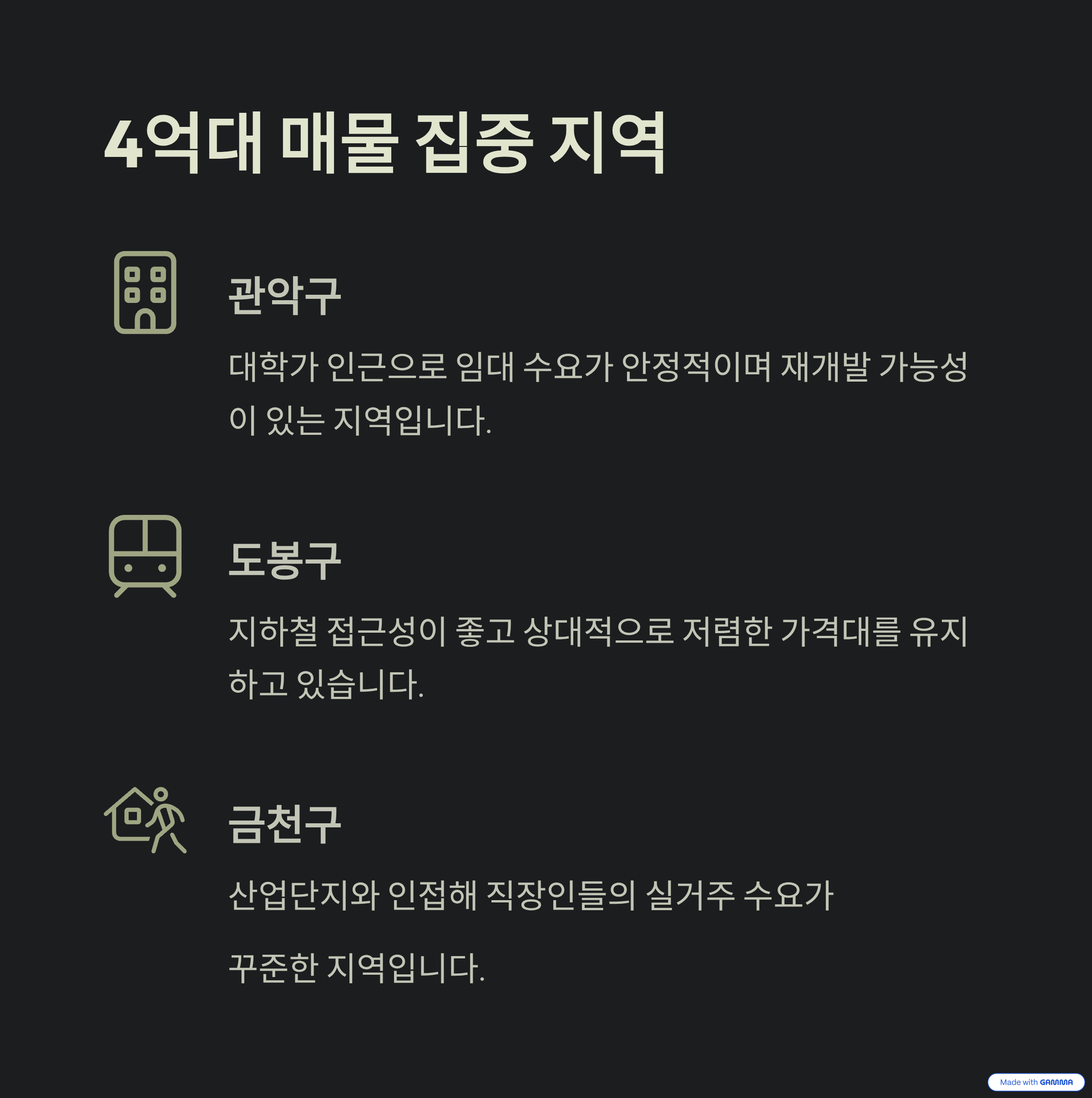 | 매물 지역 | 관악구, 도봉구, 금천구 등 외곽 | 전용 18~25평 중심 |