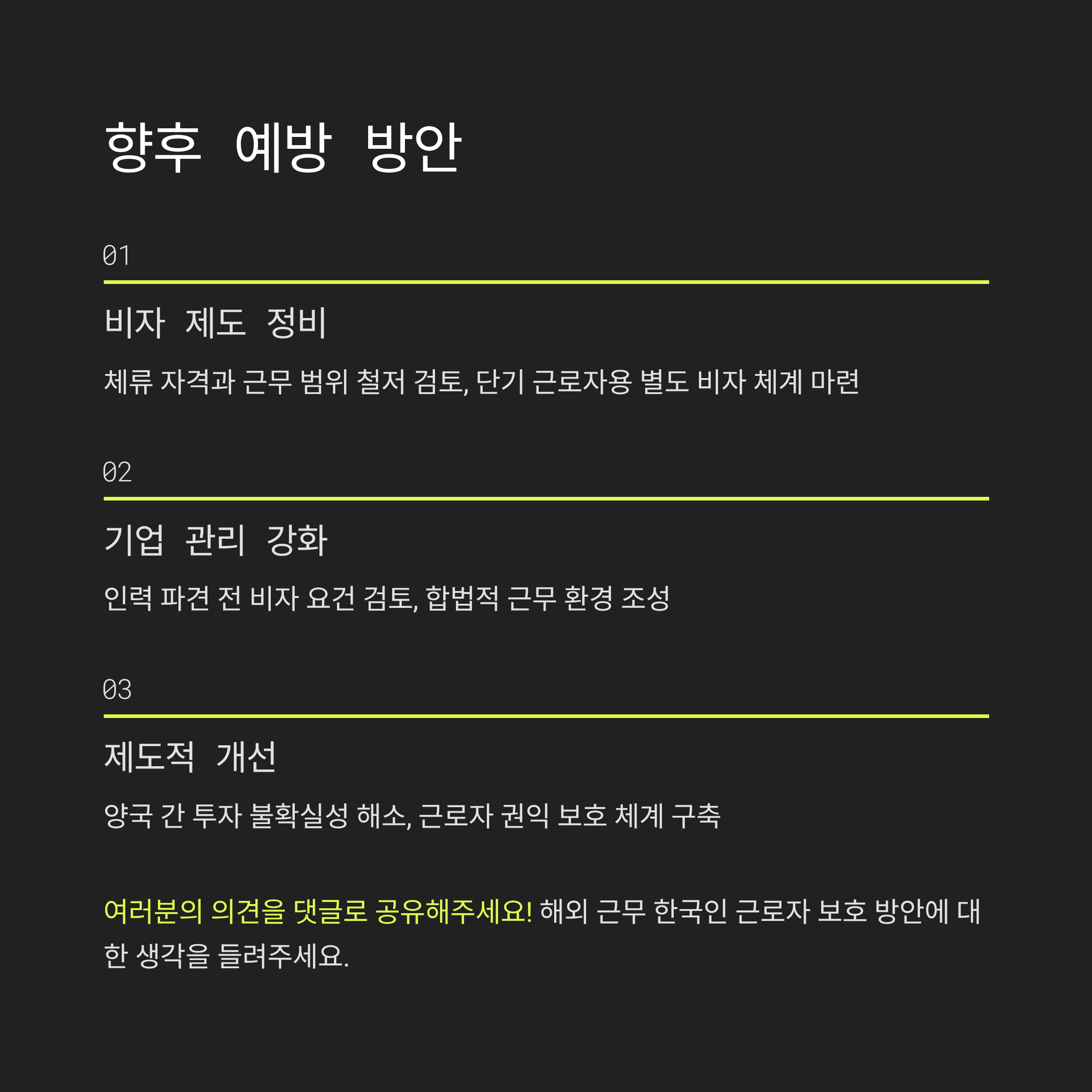 | 체류 자격과 업무 허용 범위 불일치 확인 필요 | 한국 정부 비자 제도 개선 요구 및 협의 추진 | 기업 운영 차질, 외교적 긴장 초래 |