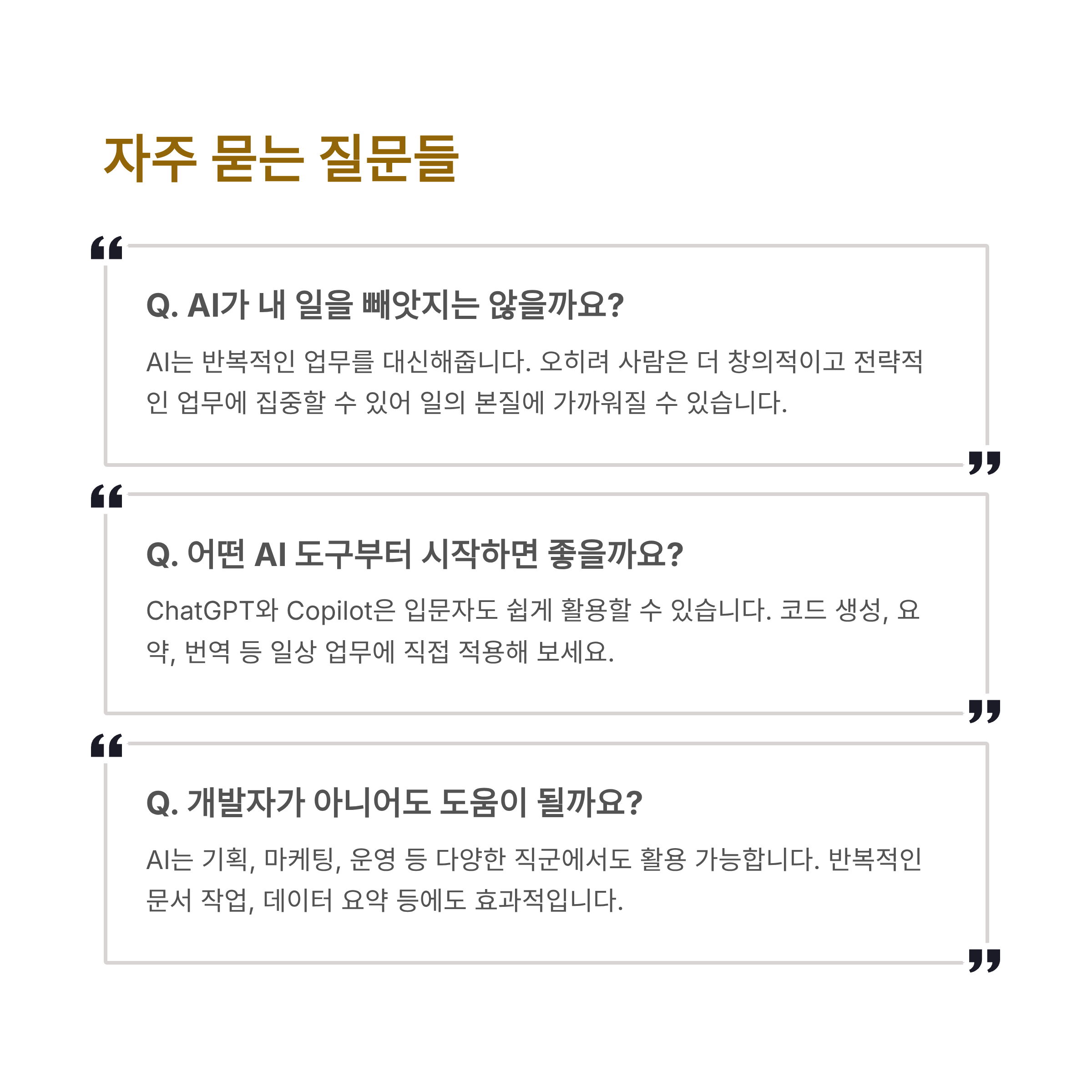 지금은 누구나 AI 도구를 쓸 수 있는 시대입니다. 중요한 건 그 도구를 어떤 방향으로 활용할지에 대한 인식입니다. AI는 당신의 경쟁자를 대체할 수도 있지만, 동시에 당신을 돋보이게 만드는 최고의 조력자도 될 수 있습니다. 오늘 하루, 새로운 도구 하나를 시도해보세요. 그리고 그 경험을 바탕으로 더 나은 내일을 준비해보는 건 어떨까요? AI는 위협이 아니라, 기회입니다. 이 글이 변화의 출발점이 되길 바랍니다.