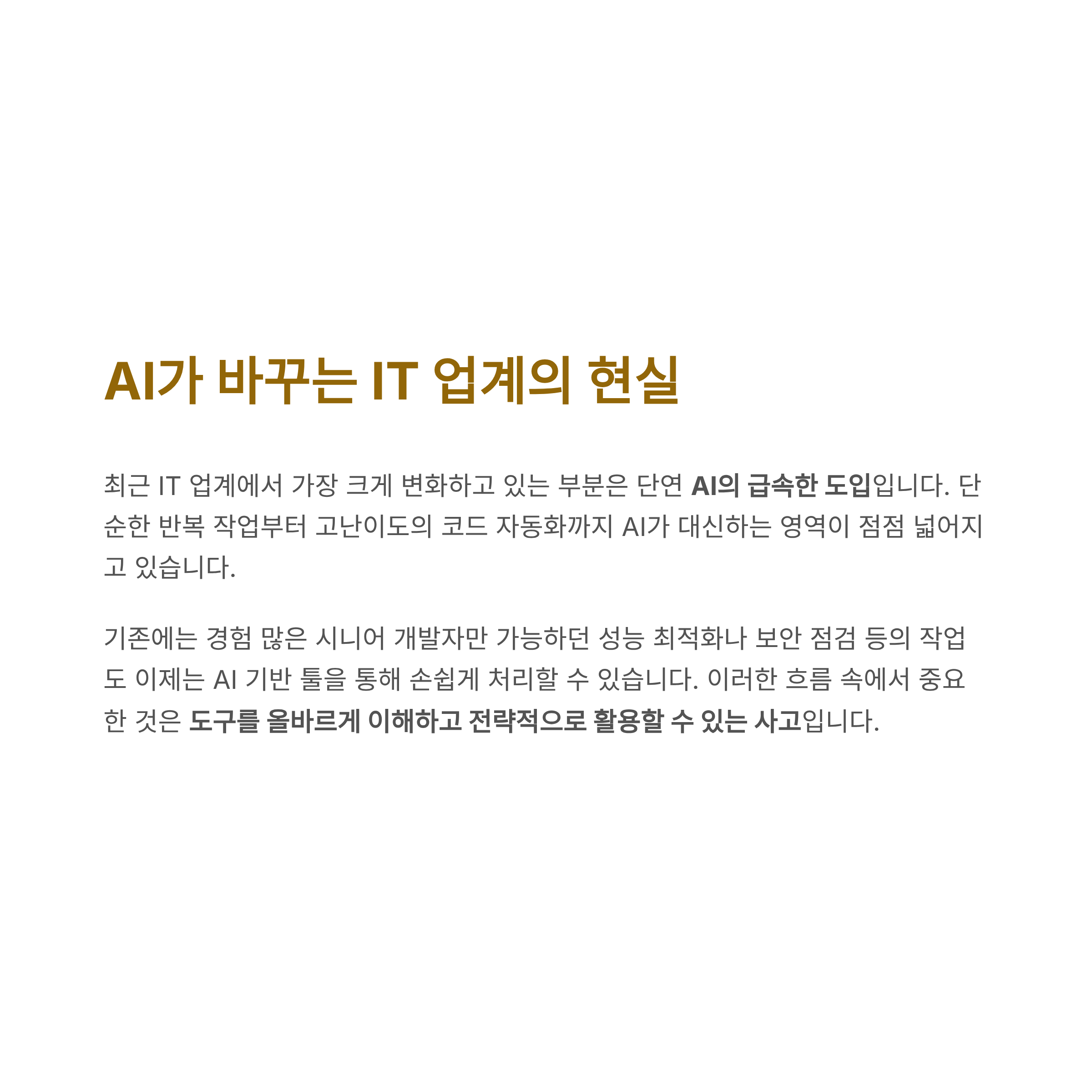 최근 IT 업계에서 가장 크게 변화하고 있는 부분은 단연 AI의 급속한 도입입니다. 단순한 반복 작업부터 고난이도의 코드 자동화까지 AI가 대신하는 영역이 점점 넓어지고 있습니다. 기존에는 경험 많은 시니어 개발자만 가능하던 성능 최적화나 보안 점검 등의 작업도 이제는 AI 기반 툴을 통해 손쉽게 처리할 수 있습니다. 이러한 흐름 속에서 중요한 것은 단순히 도구를 쓰는 능력이 아니라, 도구를 올바르게 이해하고 전략적으로 활용할 수 있는 사고입니다. 이 차이가 결국 커리어의 방향을 바꾸게 됩니다. 단순히 기술을 따라가는 것이 아닌, 기술을 기반으로 스스로 성장할 수 있는 기반을 지금부터 마련해야 할 시점입니다.